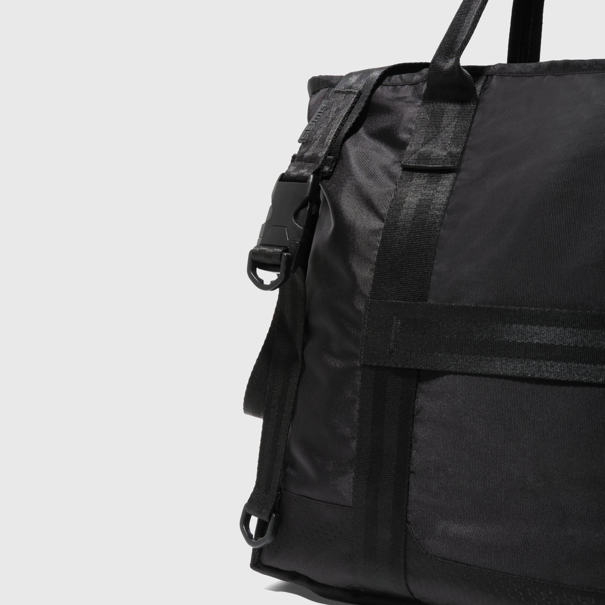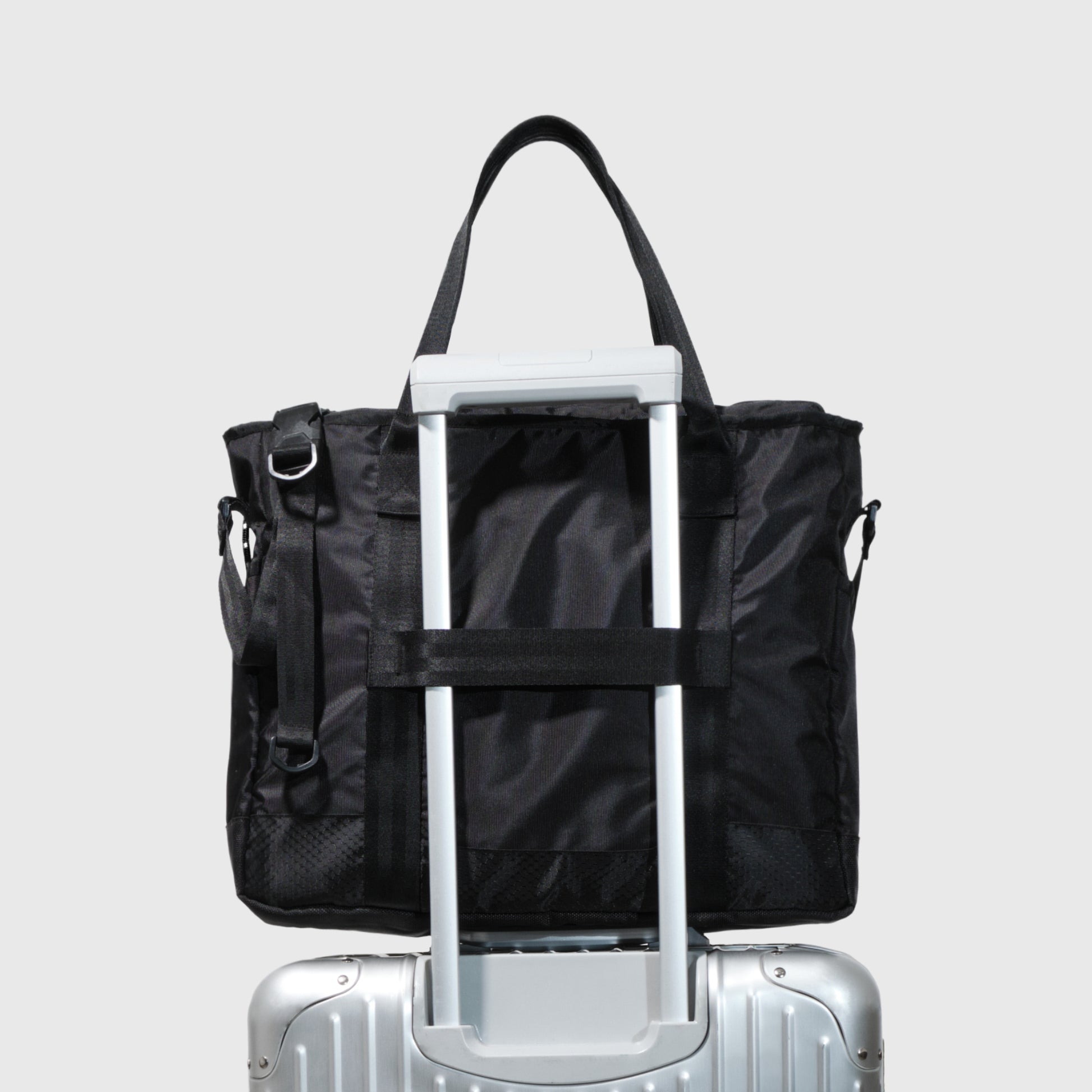 肩から下げられるショルダーストラップもついているので、重いものを入れたり両手をフリーにしたい時にはこちらを利用できます。さらに、背面にスーツケースのハンドル部にバッグを固定できるウェビングもついています。